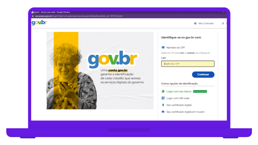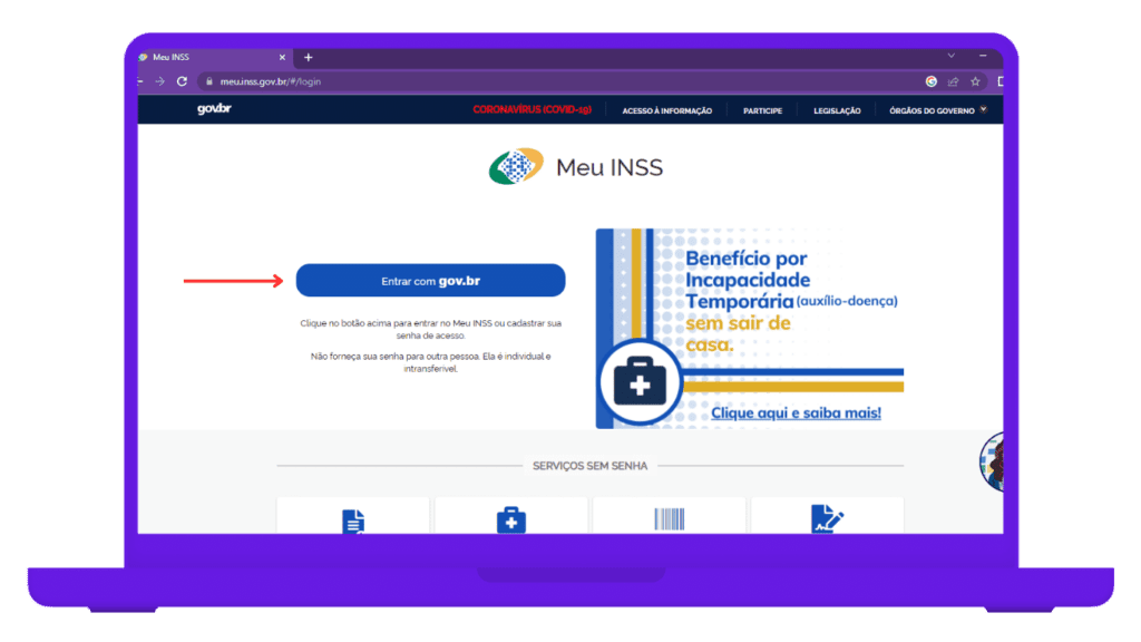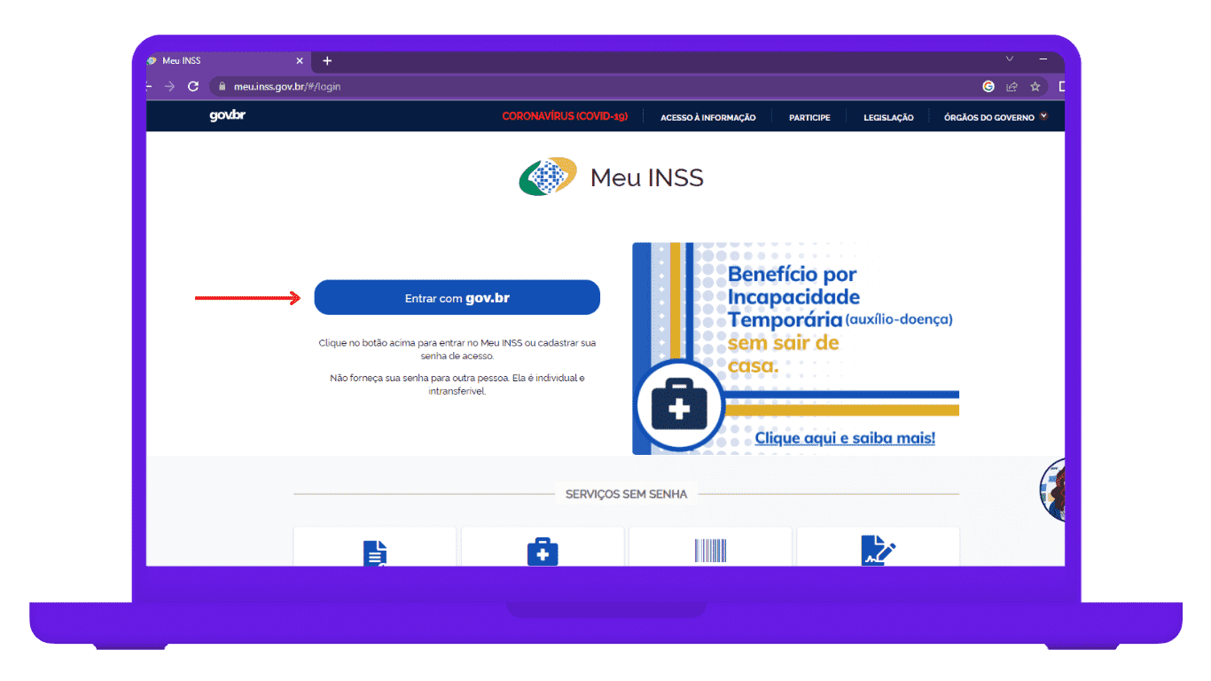 1. No site ou aplicativo Meu INSS, clique no botão “Entrar com conta gov.br”;