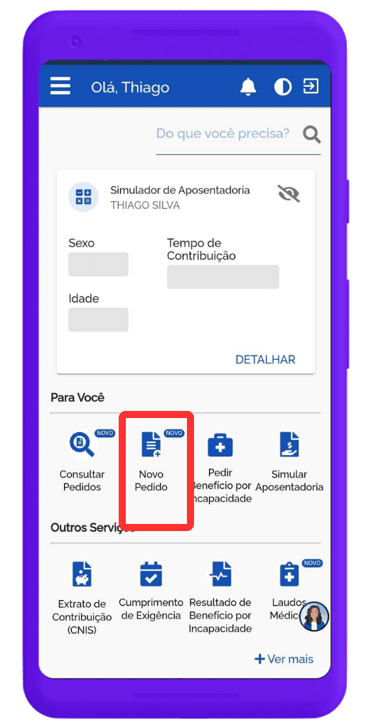 Caso você faça pelo aplicativo do Meu INSS, basta entrar no site do Meu INSS pela sua conta gov.br > ir no campo “Novo Pedido” > selecionar o benefício que está buscando > enviar sua queixa com as comprovações e finalizar.