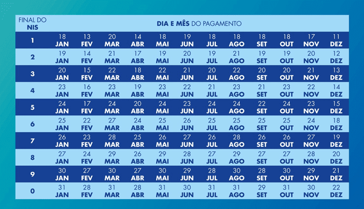 Dessa maneira, no primeiro dia de pagamento serão liberados os valores para quem tem o NIS com o final 1. Posteriormente, a cada dia útil um novo grupo tem os valores liberados, até que as pessoas com o NIS final 0 recebam.