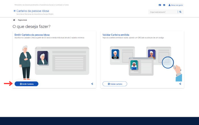 Concluída essa etapa, é hora de acessar o site da Carteira da Pessoa Idosa, da Secretaria Nacional de Assistência Social (SNAS) para, de fato, começar a emitir sua carteira. Siga os passos: