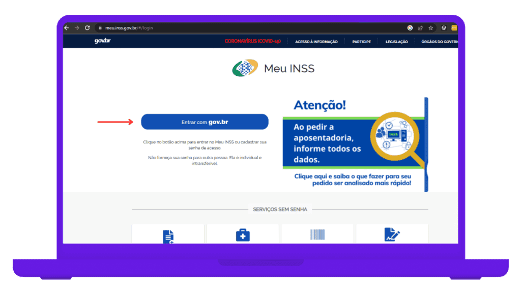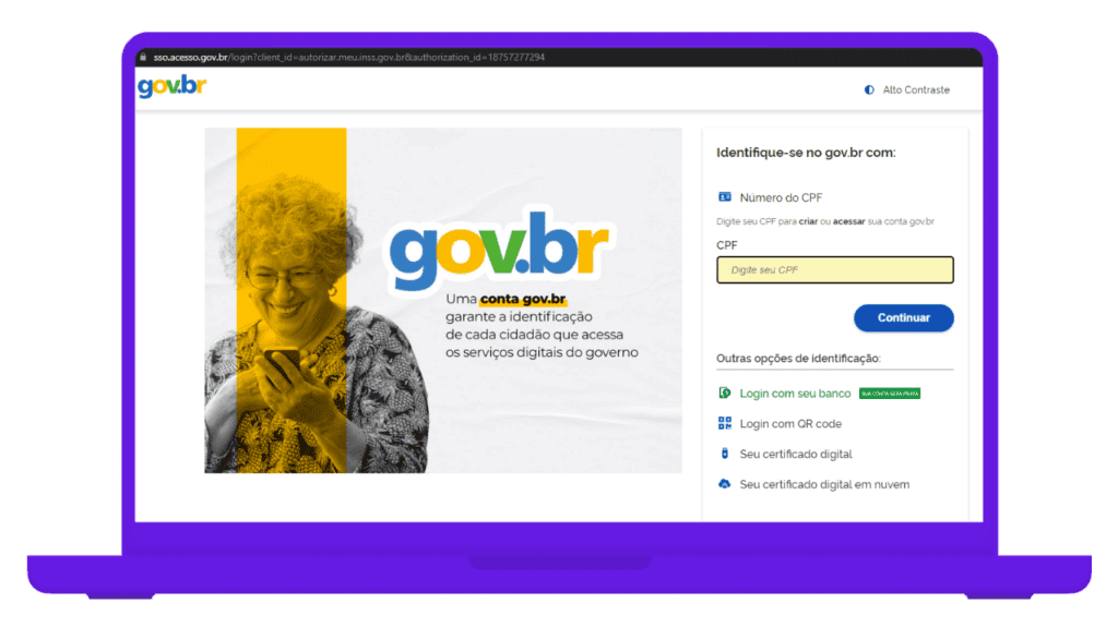 - No site ou app Meu INSS, clique em “Entrar com conta gov.br”;