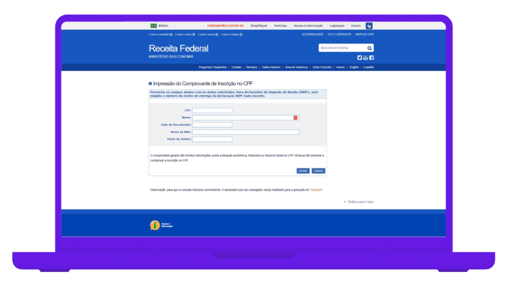 Se você não declara Imposto de Renda, basta acessar o site da Receita Federal, preencher os dados solicitados e visualizar o seu comprovante.