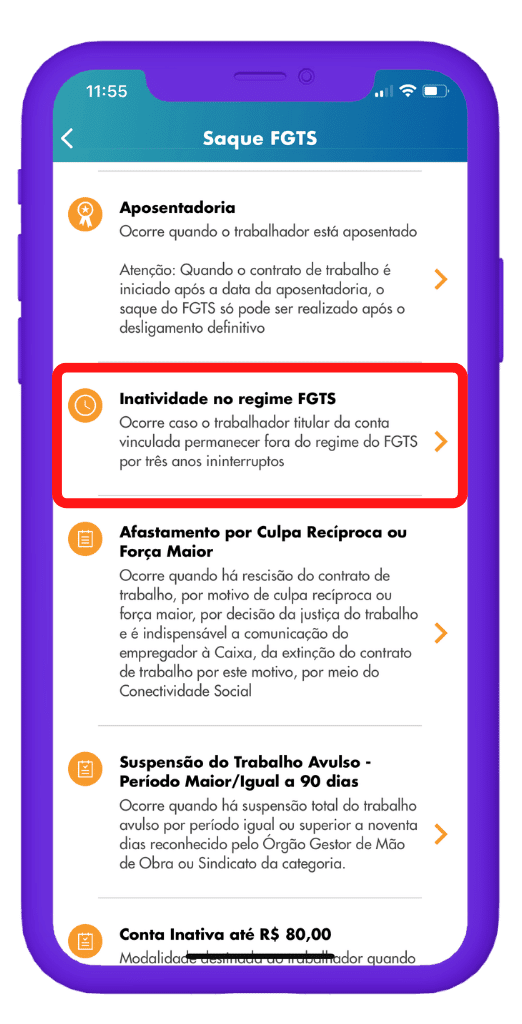 4. Em seguida, deslize a tela e procure pela opção “Inatividade no regime FGTS“;