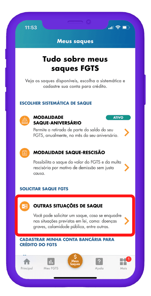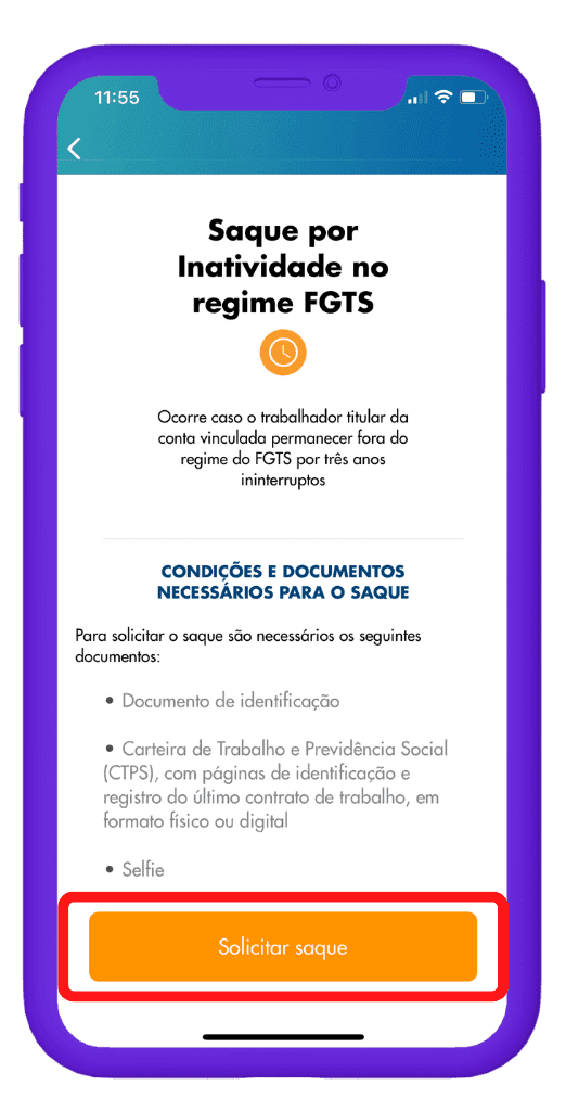 Para realizar isso, basta seguir a ordem: Meus Saques > Outras situações de saque > Inatividade no regime FGTS > Solicitar saque.