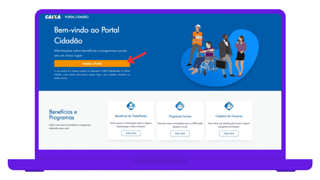 Acesse o site do Portal Cidadão da CAIXA e clique em ‘Acesse o Portal';