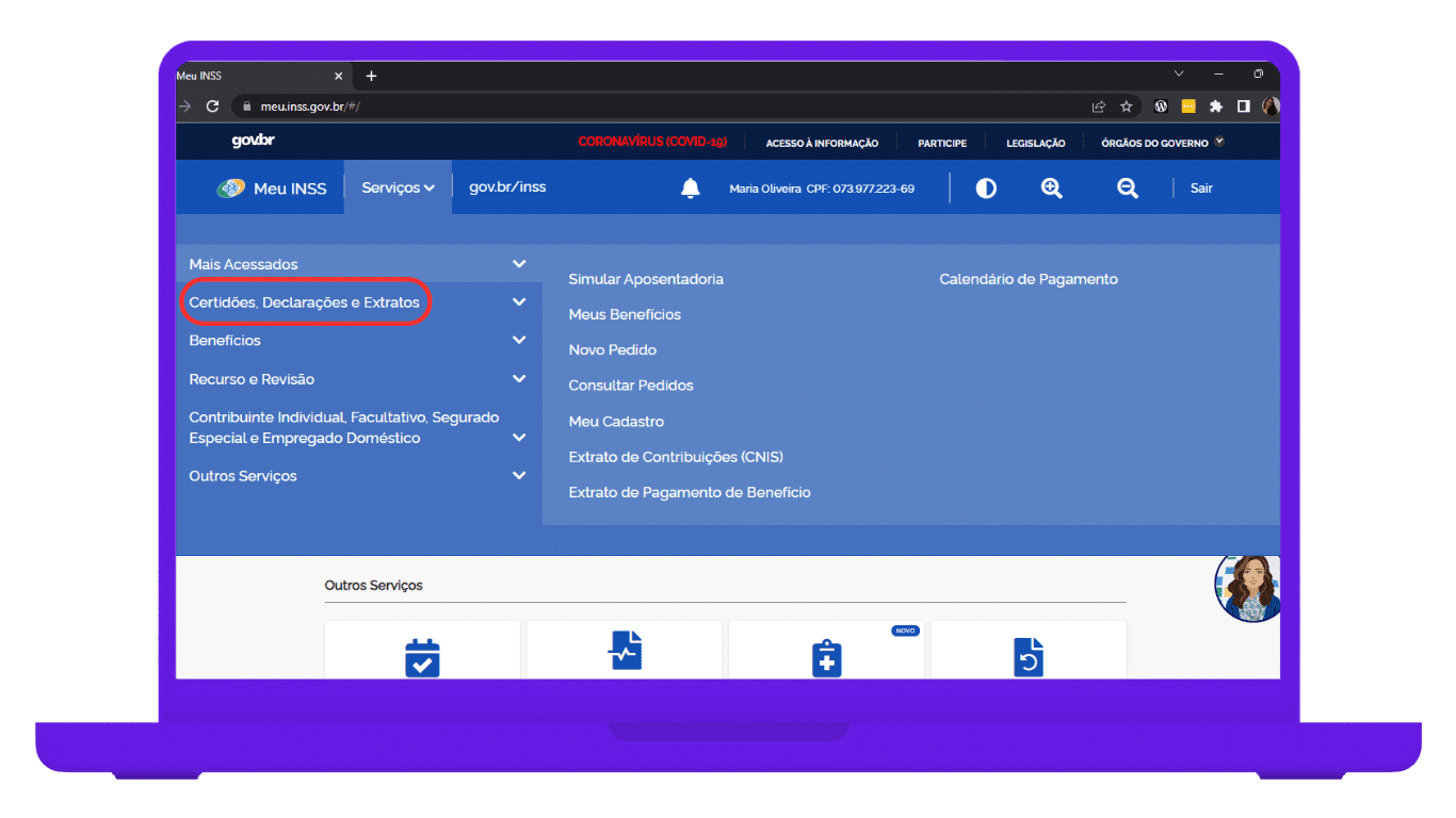 2. Ao fazer o login com seu usuário (CPF) e senha, busque pela opção “Serviços” e clique em “Certidões, Declarações e Extratos”;