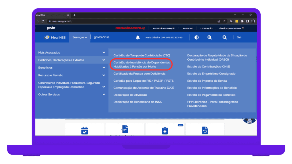 3. Ao clicar, escolha a opção de “Certidão de Inexistência de Dependentes Habilitados à Pensão por Morte”;