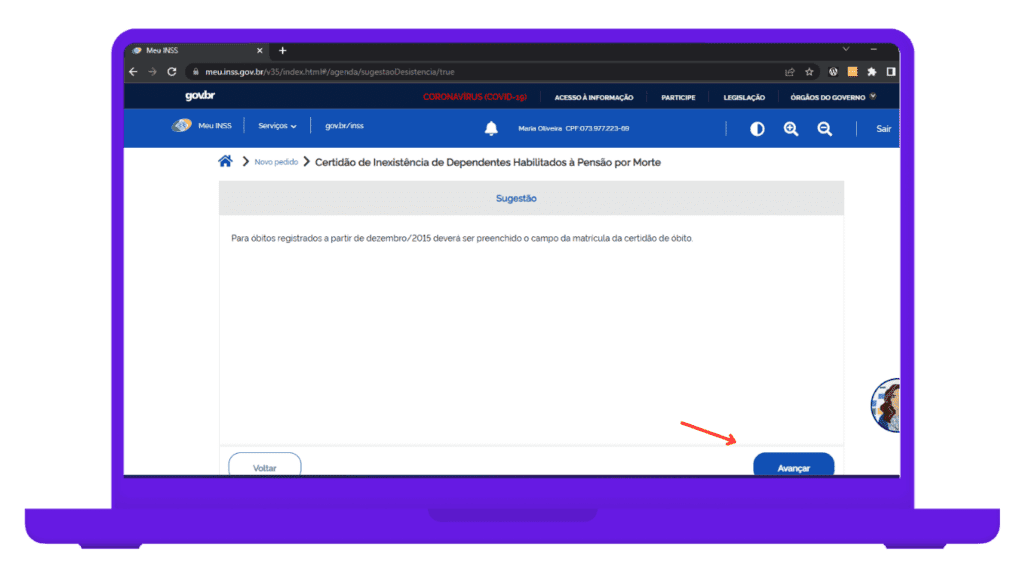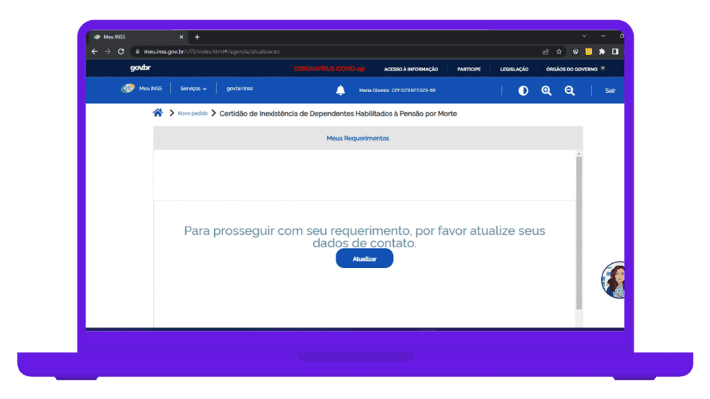 Em relação ao segurado falecido, é necessário, como foi informado pelo site, incluir o número da matrícula da certidão de óbito, além do CPF do falecido e qual a relação de parentesco do requerente e do falecido.