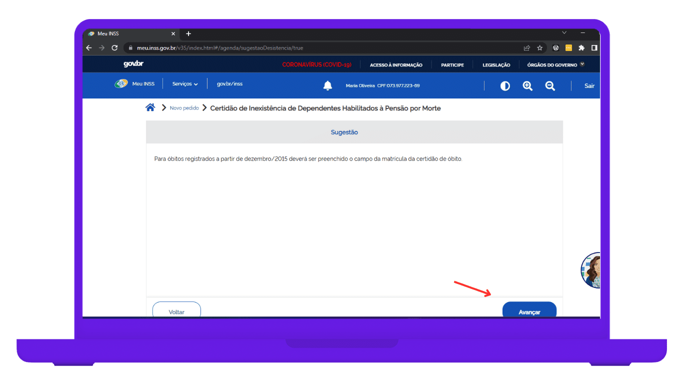 5. Ao checar os dados e fazer a atualização (se necessário), clique, na próxima tela, em “Avançar”;