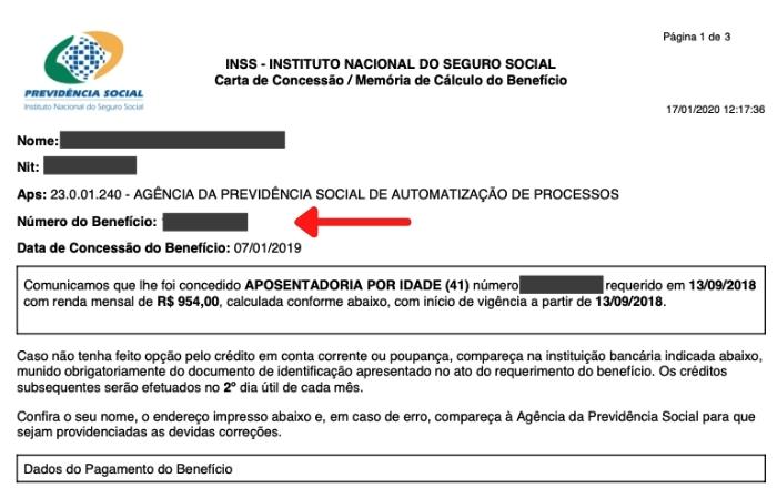 - Na primeira página da carta de concessão procure por “Número do Benefício”;