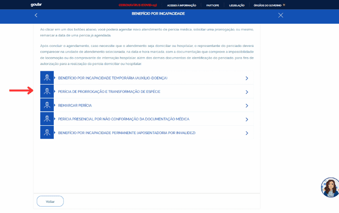 3. Selecione, então a opção “Perícia de Prorrogação e transformação de espécie” e clique em “ciente” para prosseguir;