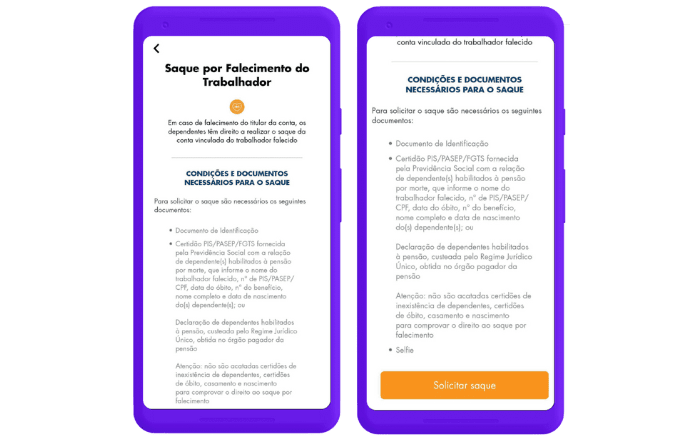 Lembre-se: Não serão aceitas as certidões de inexistência de dependentes, certidões de óbito, casamento ou nascimento para fazer a comprovação de direito ao saque por falecimento.