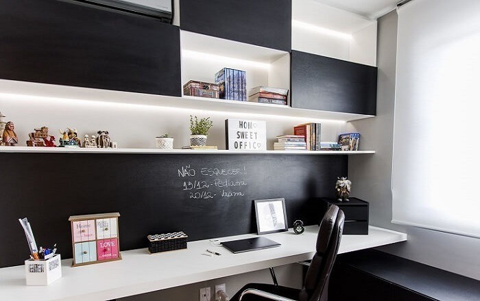 No home office você pode substituir o uso de post-its e escrever nas paredes com giz frases motivacionais, lembretes, eventos e reuniões importantes, calendários e o que mais precisar.