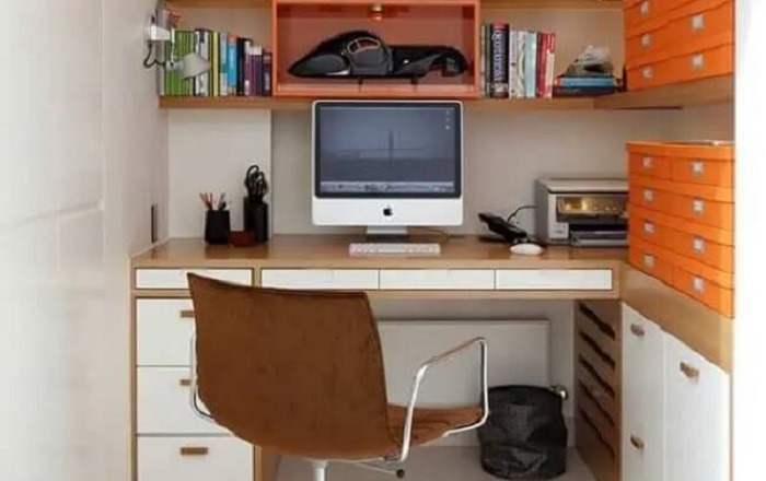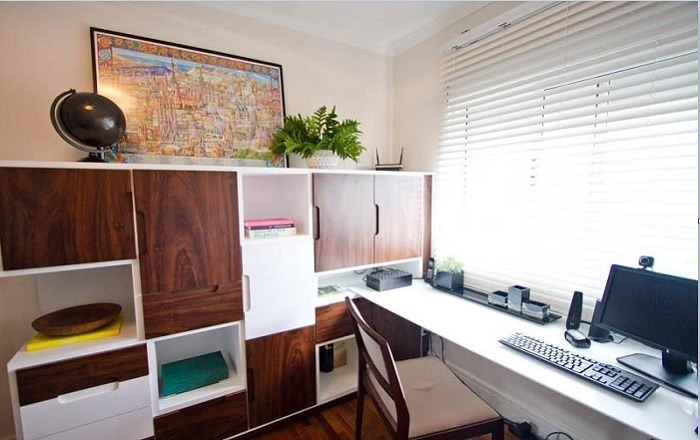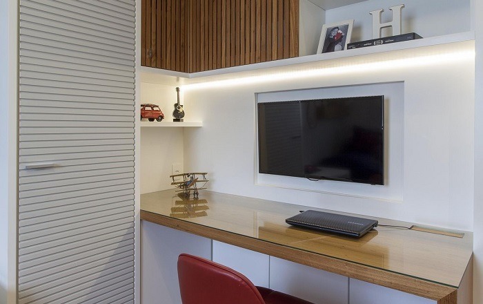 Use e abuse de prateleiras e nichos combinados com cremalheiras e mãos francesas, pois além de agregar beleza à decoração do ambiente também auxiliam na exposição de objetos e organização de itens do home office.
