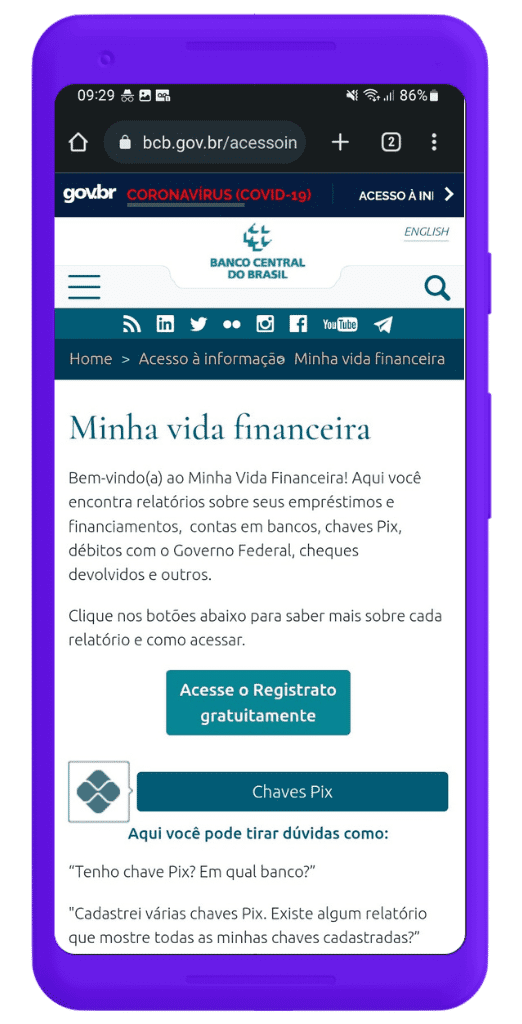 Para acessar as informações contidas no Minha Vida Financeira do Banco Central, basta fazer o seguinte passo a passo: