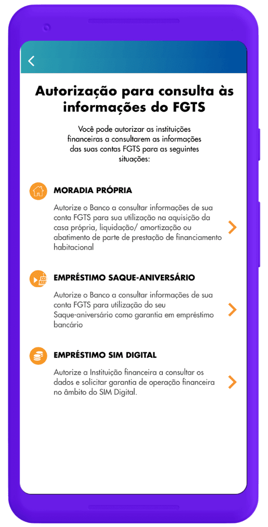 Depois de escolher quais bancos você quer fazer o empréstimo FGTS, será preciso liberar a consulta. Esse processo é feito por meio do aplicativo do FGTS e totalmente seguro.