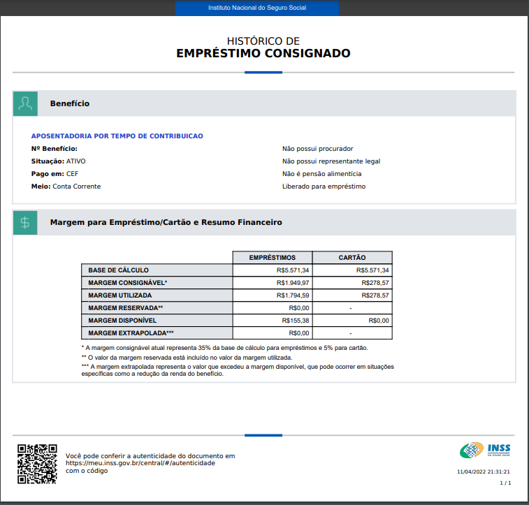 No extrato você vai conseguir ter acesso ao cálculo de margem consignável referente ao valor do seu benefício, ou seja, o seu limite de contratação de crédito consignado.