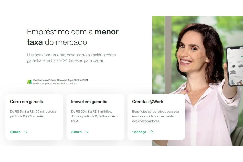 O foco da Creditas é o empréstimo com garantia de imóveis, veículos e o empréstimo consignado privado caso a sua empresa possua convênio com a plataforma.