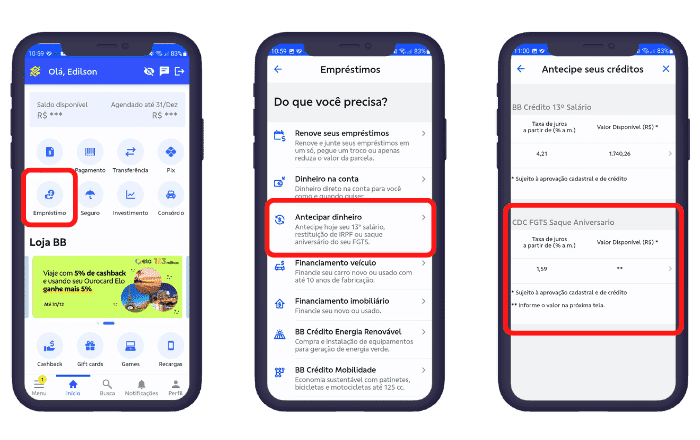Entrar no app do Banco do Brasil e procurar pela opção “Empréstimo” na tela. Em seguida, vá em “Antecipar dinheiro” e aperte em “CDC FGTS Saque Aniversario”.