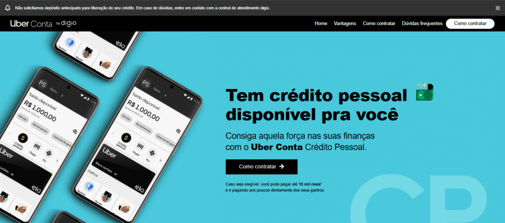 Para quem precisa fazer empréstimo para motorista Uber, existe a possibilidade de contratar credito pessoal. Em parceria com o Banco Digio, a plataforma disponibiliza o Uber Conta Crédito Pessoal, com condições exclusivas para motoristas parceiros.