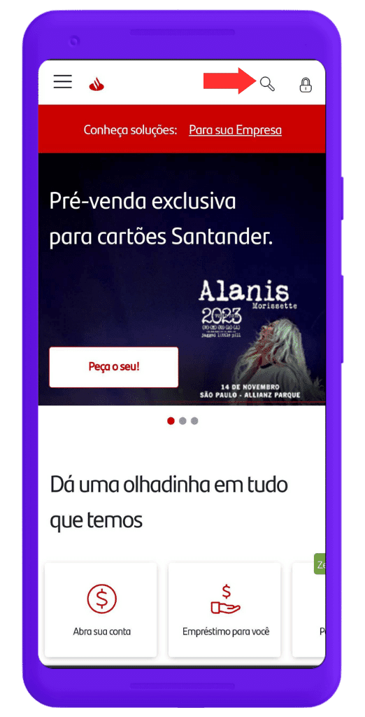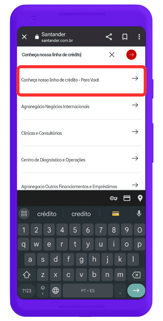 3. Busque por “Conheça nossa linha de crédito – Para você” na barra de busca;
