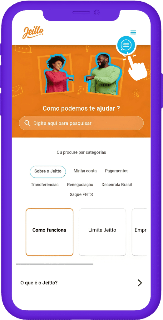 1. Acesse o site: jeitto.com.br/me-ajuda; 2. Clique no ícone do Chat para abrir o atendimento automático;