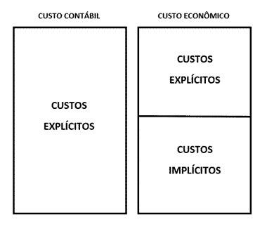 No custo contábil, somente os custos explícitos são levados em consideração, enquanto que, no custo econômico, também precisamos considerar os custos implícitos.