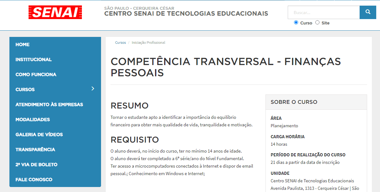 Curso de finanças pessoais Senai-SP