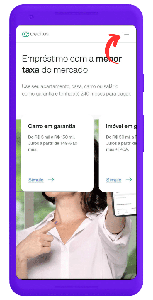 1. Acesse o site da Creditas e selecione as dias linhas ═ que ficam no canto direito da tela;