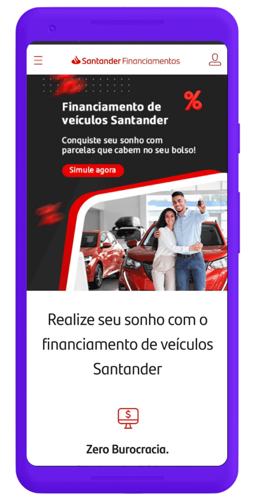 O financiamento de veículos pelo Santander é bem simples: você escolhe o seu automóvel, informa o valor de entrada e é só realizar o empréstimo segundo as condições acordadas.