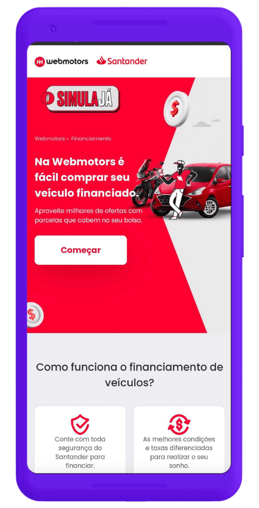 Além das opções acima, o Webmotors faz parte do Grupo Santander e oferece condições de mais fácil acesso e online de financiamento de veículo.