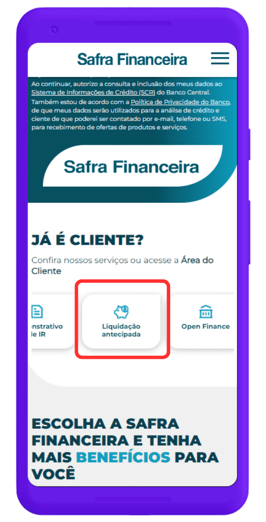 Esse serviço é principalmente voltado para quem solicitou financiamento de veículo na Safra Financeira e busca quitar o valor.