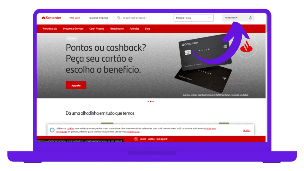 2. Ao entrar, digite seu CPF para entrar na conta Santander;