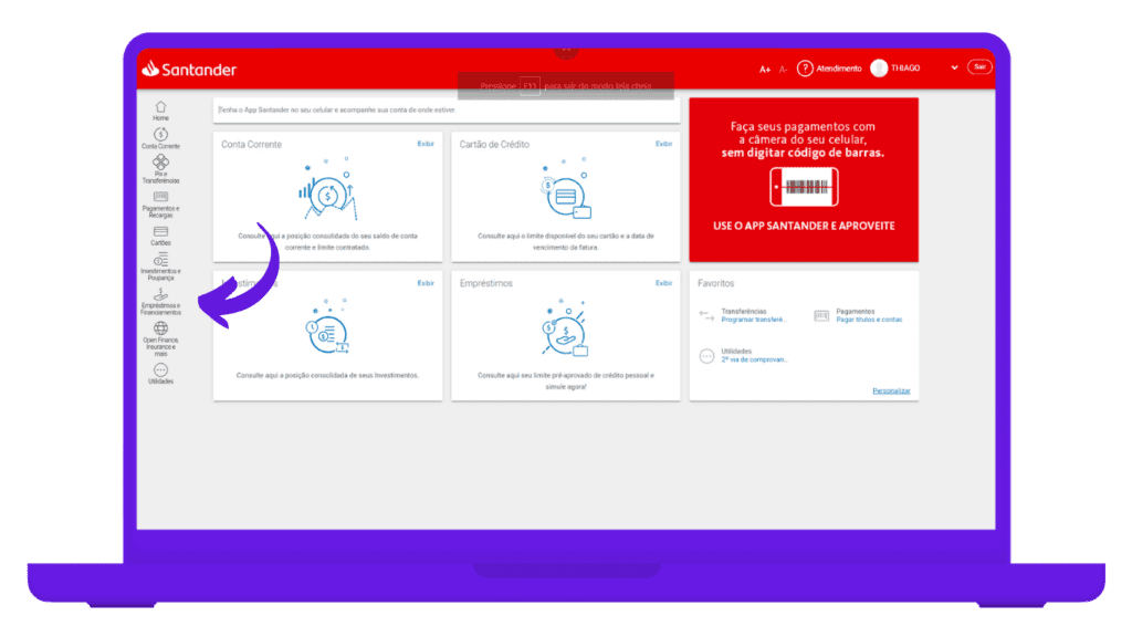 Já pelo site, você fará isso pelo Internet Banking do Santander. Para isso, basta: