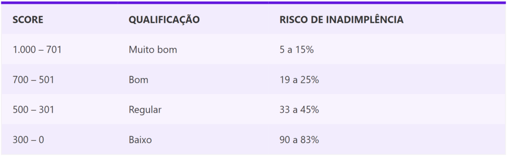 Essa pontuação é representada por uma tabela de score, que vai de 0 a 1000 pontos. Quanto maior a pontuação, maior a probabilidade de ter acesso ao crédito.