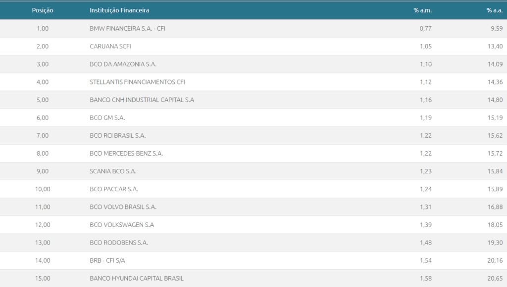 Ao selecionar essa opção, você encontrará as taxas de juros das principais instituições financeiras que realizam o financiamento de veículos.
