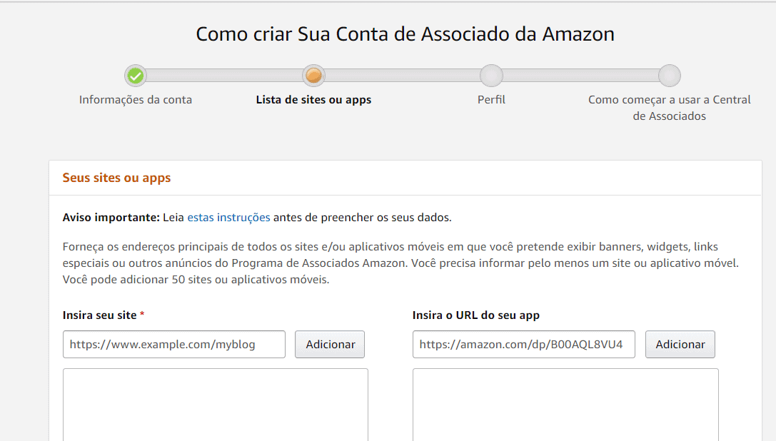 Passo 2: Preencha todas as informações solicitadas, clique em “continuar” no canto inferior esquerdo e, logo após, preencha o seu site/blog ou seu aplicativo onde deseja exibir banners, widgets ou links da Amazon.