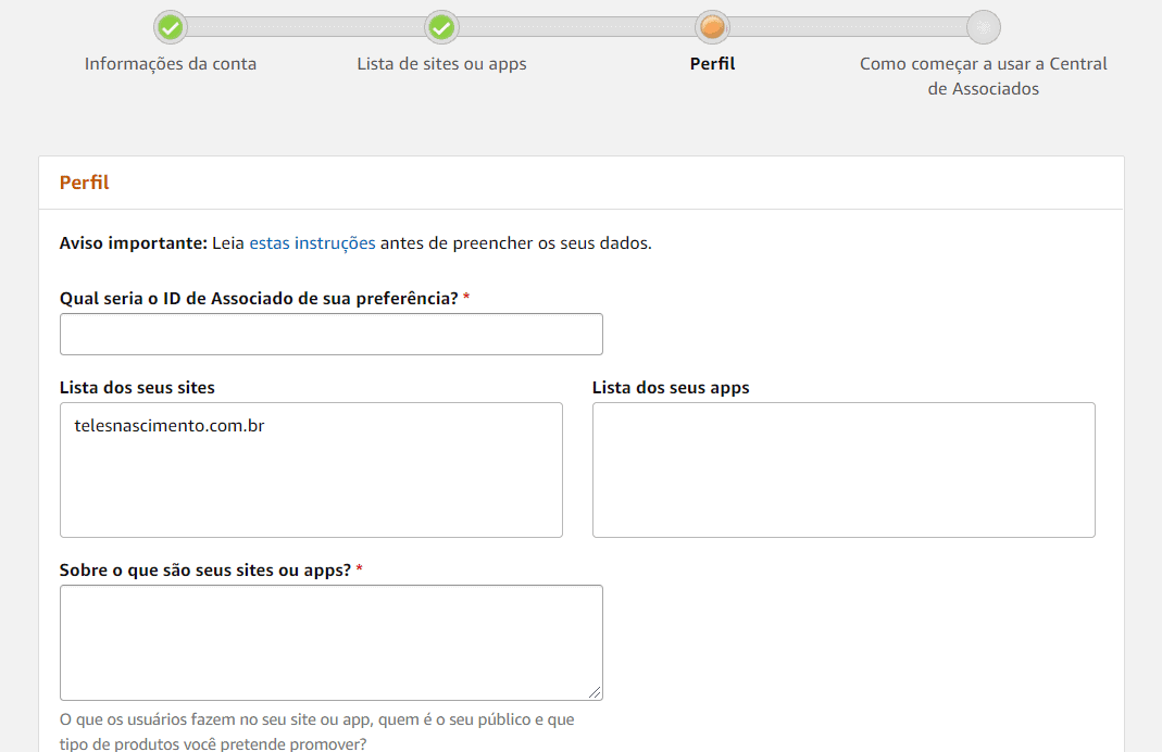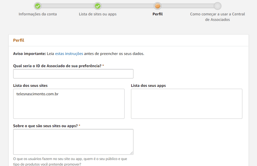 Passo 3: Na tela de cadastro de Perfil você irá inserir sua preferência de nome de usuário e preencher quais tipos de produtos da Amazon deseja publicar.