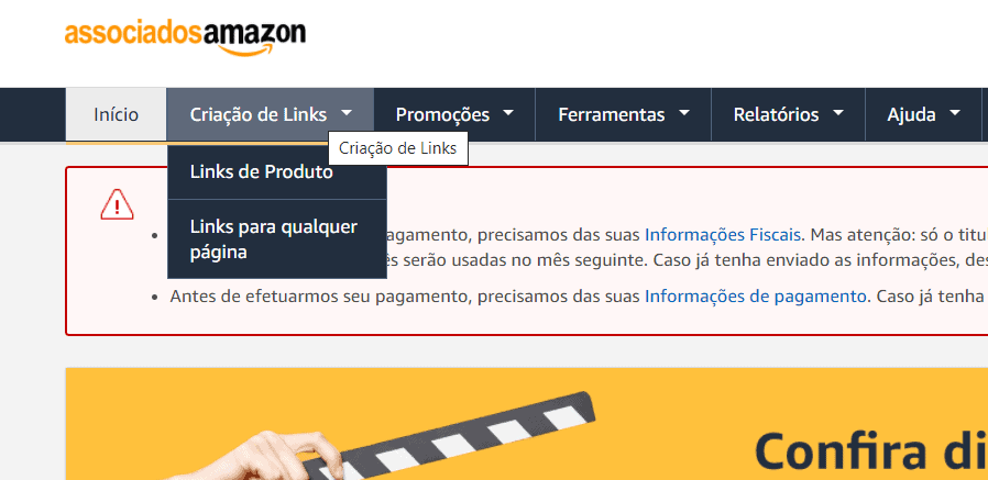 Após entrar em sua conta de associado, aperte no botão “criação de links” e gere links de produto caso você deseje divulgar apenas um produto ou links para qualquer página caso deseje divulgar em sua página produtos aleatórios.