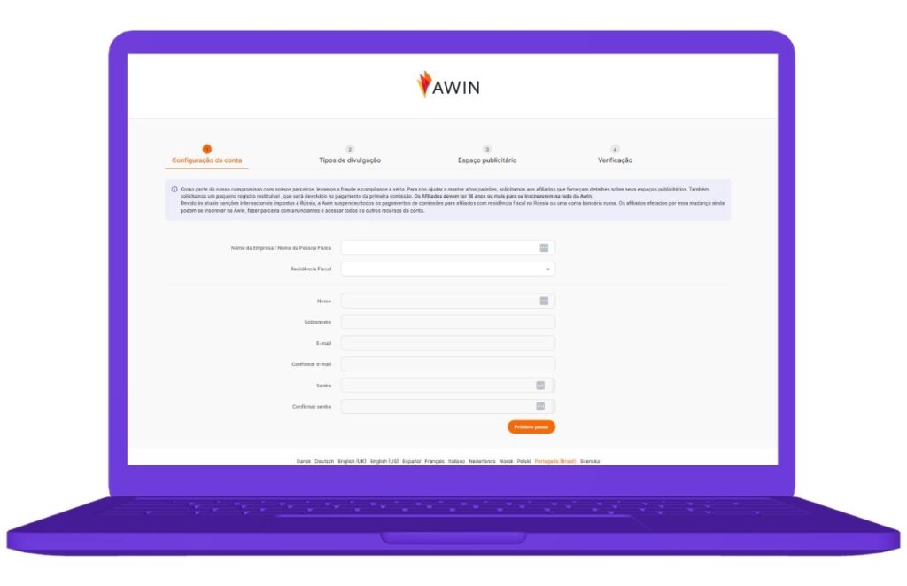Awin é uma plataforma de marketing de afiliados que conecta criadores de conteúdo a marcas para monetizar sites e redes sociais. O processo de inscrição envolve as seguintes etapas: