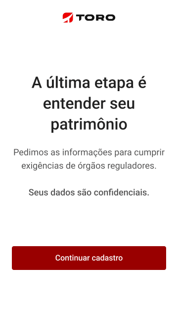 Por último, como exigência dos órgãos reguladores, é necessário fornecer informações sobre o seu patrimônio. Lembre-se de que seus dados estão seguros ao abrir conta na Toro, pois são informações confidenciais: