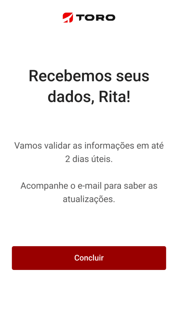Após seguir todos os passos para abrir a conta na Toro, basta aguardar a aprovação, que pode levar até 2 dias úteis. Nesse período, a instituição avaliará as informações e documentos enviados para liberar o acesso à conta.