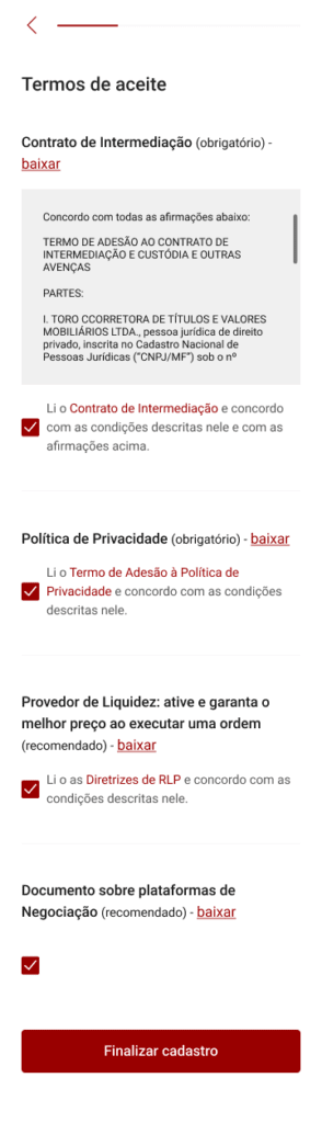 A Toro conta com um aplicativo disponível para Android e iOS. Por meio dele, é possível fazer a abertura de conta assim como no site.