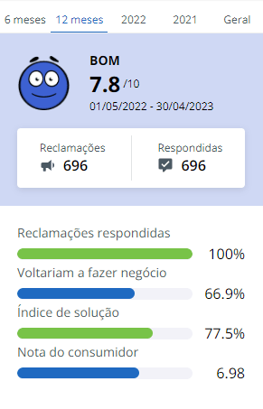 No Reclame Aqui, a nota da corretora Avenue é 7.8, o que é considerado bom. Além disso, ela tem um índice de solução de 77,5%, e 66,9% dos clientes dizem que voltariam a fazer negócio.