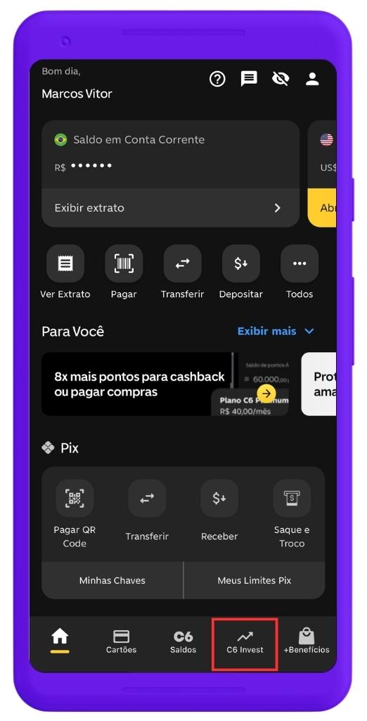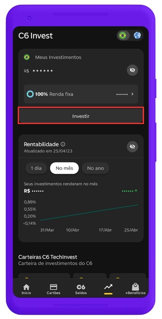 Na tela do C6 Invest, basta clicar em Investir.