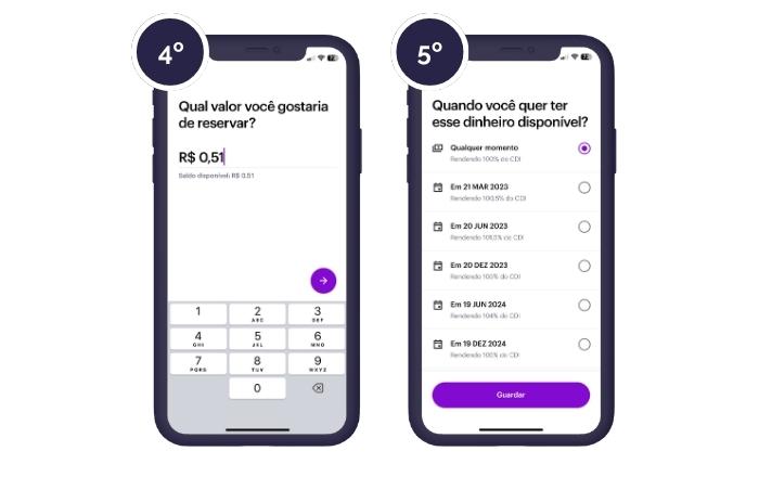 Para isso, existem duas modalidades principais de investimento Nubank: deixar o dinheiro parado na conta corrente e aplicar na função “Guardar Dinheiro”.