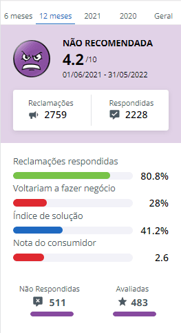 Dentre as pessoas que votaram, somente 28% voltariam a fazer negócio e eles deram uma nota 2.6 para o serviço geral. Ademais, somente 41,2% das reclamações foram solucionadas.