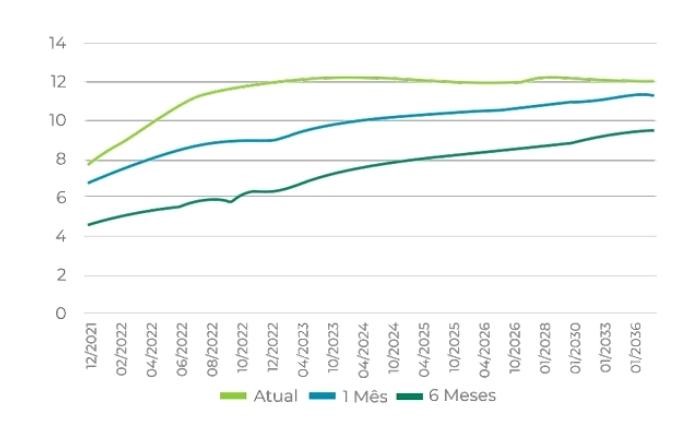 Por exemplo, se hoje o mercado acredita que em 2030 a taxa de juros estará em 10%, mas há um mês ele acreditava que estaria em 8%, a curva de juros de hoje será diferente da do mês passado.