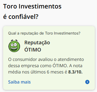 No ReclameAqui, por exemplo, a reputação da Toro é avaliada como “Ótima” pelos clientes, com uma nota média de 8.1/10 nos últimos 6 meses.