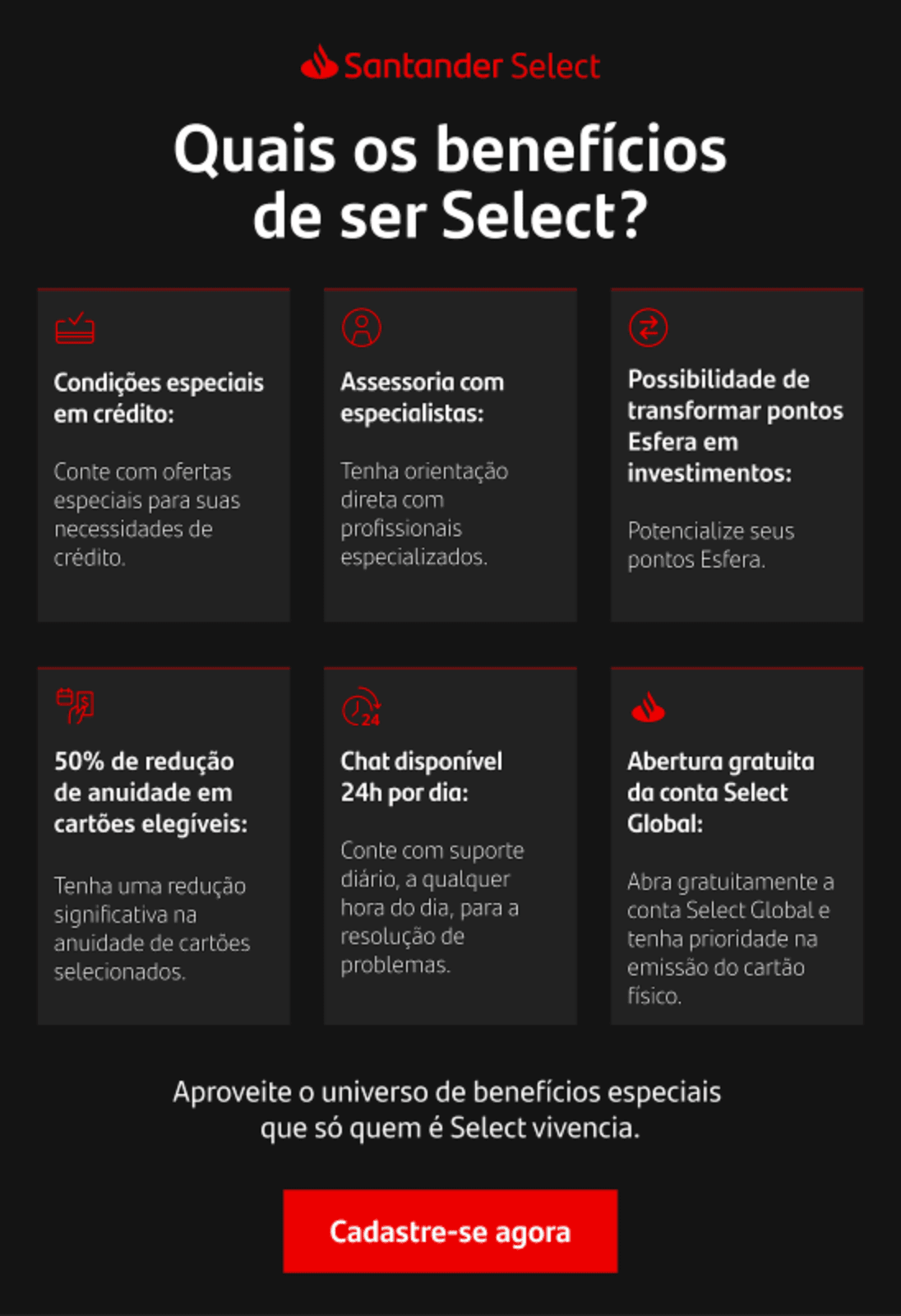 - Conta Corrente Santander: a conta Select Global estará disponível para os clientes correntistas dos segmentos: Especial, Van Gogh, Select e Private. Para abrir a conta Select Global é necessário que o cliente seja: • Ser cliente correntista pessoa física do Santander Brasil; • Ser maior de 18 anos; • Ser residente fiscal no Brasil;